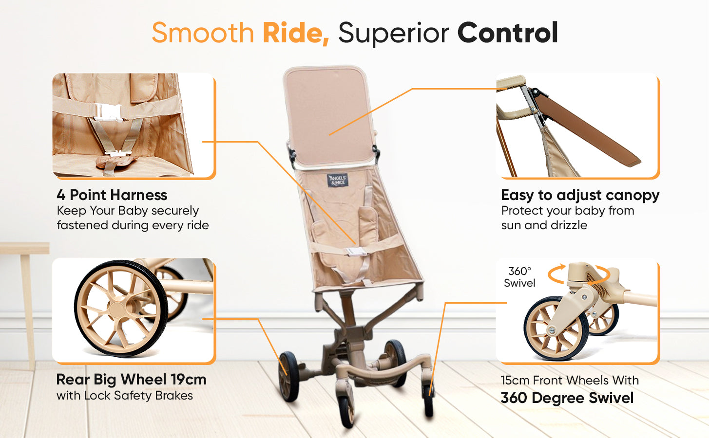 Cruise smoothly across city streets, parks, or bumpy sidewalks. The largeย 19 cm rear wheelsย offer enhanced stability, while theย 360-degree front wheel swivelย ensures effortless movement.