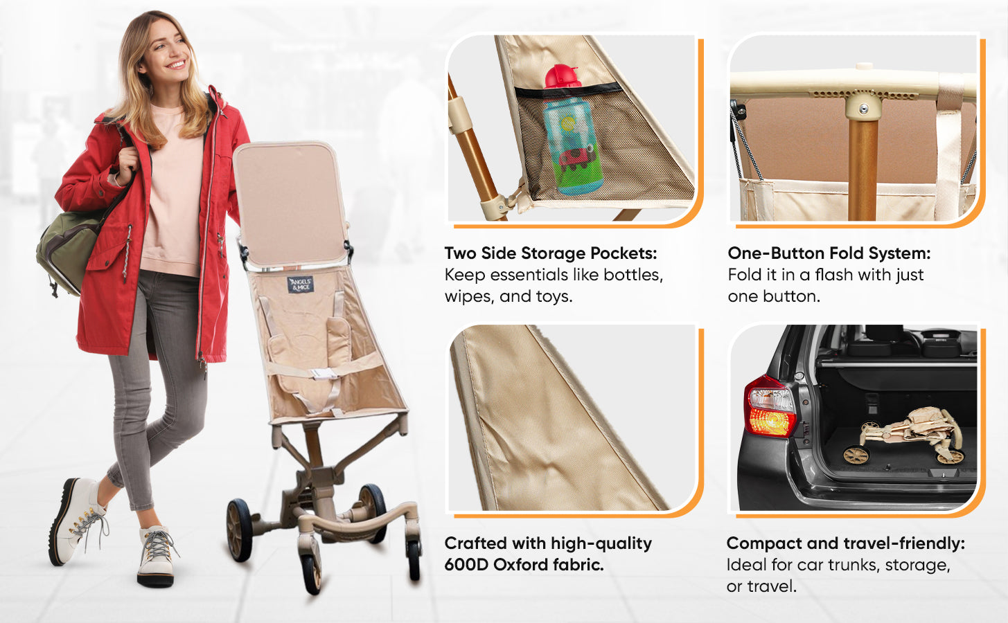 The Angels & Mice Travel Cruiser Stroller is the perfect companion for your family adventures. This sleek and sophisticated stroller for kids aged 2-7 years features a premium frame with elegant gold accents, designed for both boys and girls. Its lightweight, foldable pushchair design makes it ideal for travel, while the compact fold mechanism allows for easy storage and transport. The height-adjustable sunshade provides essential protection, and the big, durable wheels ensure smooth navigation. Equipped with a secure 4-point safety harness, a wide, comfortable seat, and a sturdy four-wheel structure, it offers excellent stability and maneuverability. This versatile choice for modern parents combines style with everyday practicality.