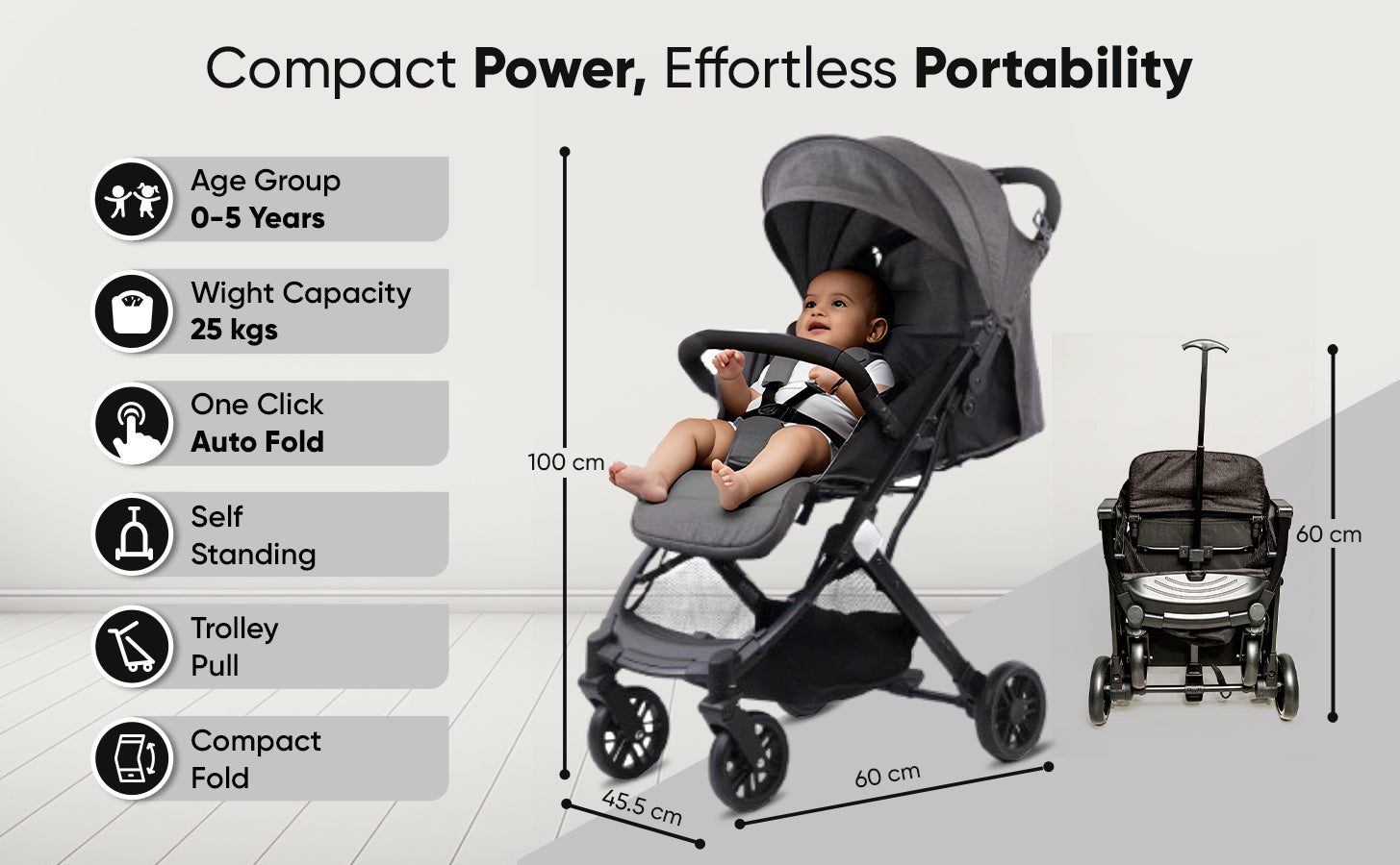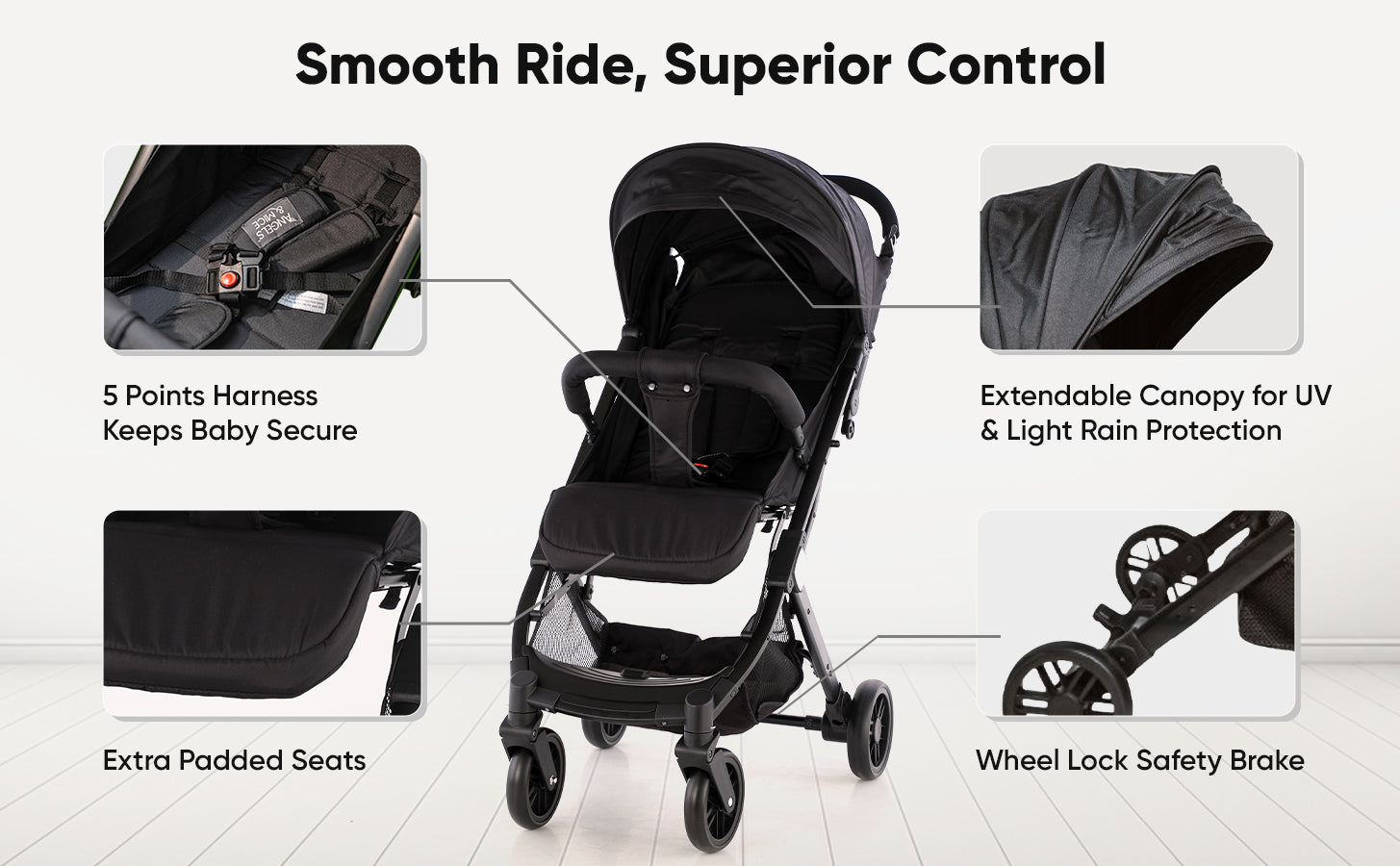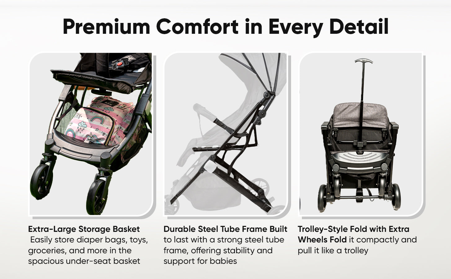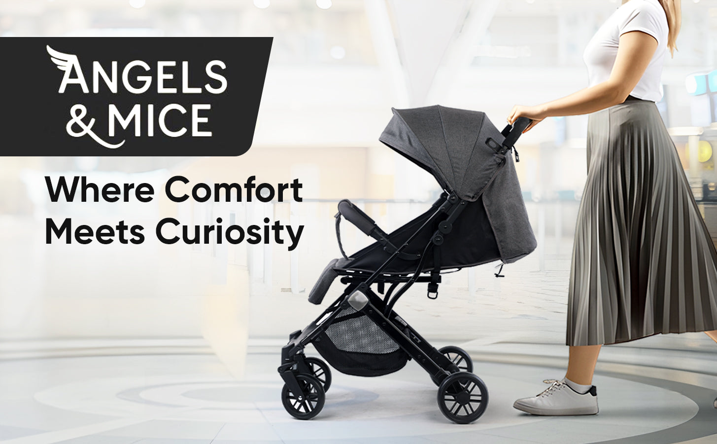 Meet the Angels & Mice Urban Glide Baby Stroller โ€“ a thoughtfully designed pram combining comfort, convenience, and safety. Crafted with a durable steel tube frame, the Urban Glide is sturdy yet lightweight, built to support your child from birth. The fully reclining seat and adjustable footrest make it safe for newborns, while the strong structure supports growing toddlers. This stroller features an auto-fold mechanism and a trolley pull-along handle, making it incredibly easy to manage while traveling. Its cabin-friendly size ensures it fits easily into car trunks and airplane overhead bins.