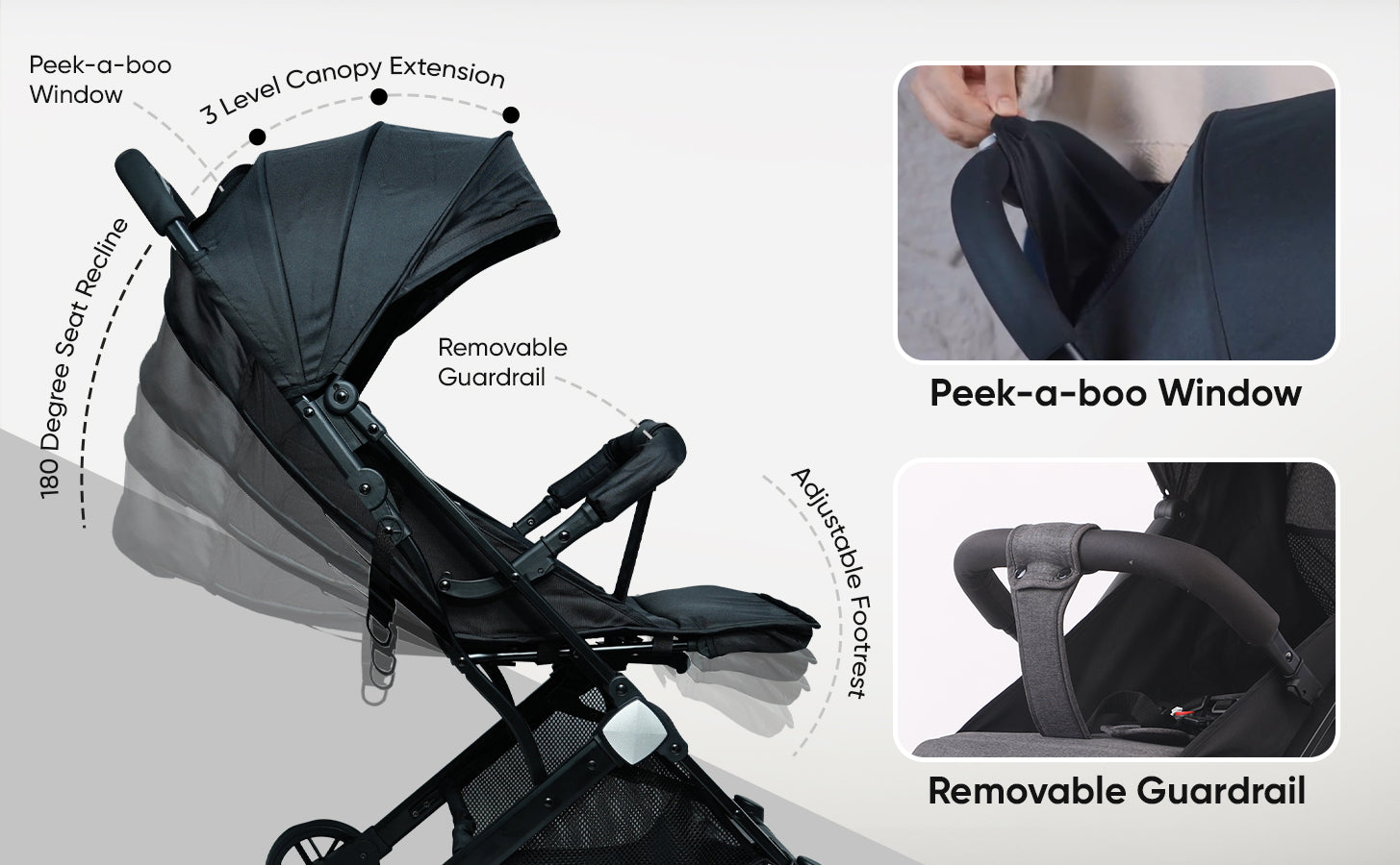 • Extendable Sun Canopy: Multi-level sunshade with a peek-a-boo window lets you check on your baby easily.